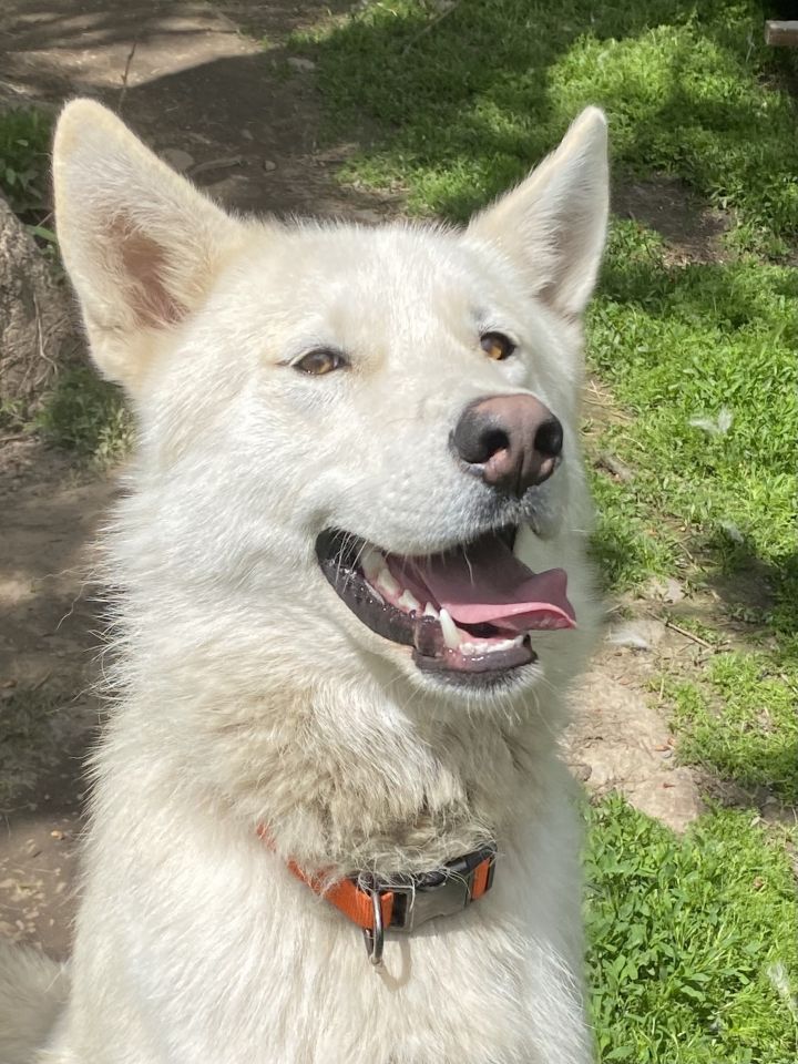 Looks to be some sort of northern breed mix, white but very dirty, amber eyes.